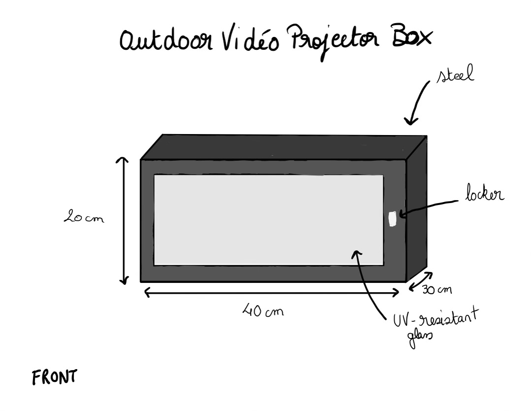 The casing's design incorporates versatility, allowing it to be adapted for different public settings, including parks, coffee shops, and city streets. This flexibility is achieved through various mounting options—stands for parks, rubber feet for cafes, and pole mounts for urban areas. The simplicity of the casing design ensures that it remains unobtrusive, focusing the public’s attention on the projected art rather than the equipment itself.