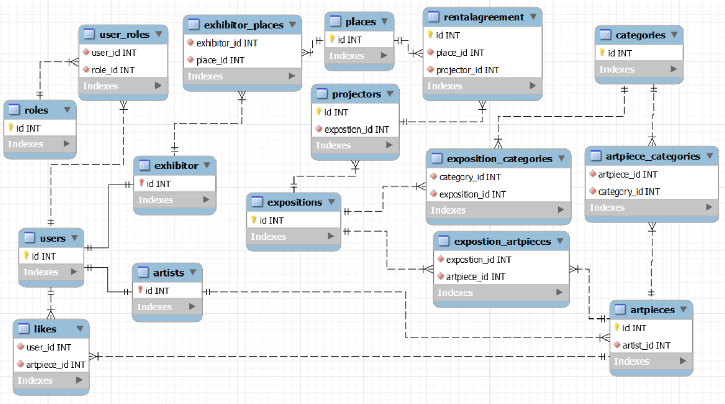 During the development of the software prototype, there were minimal deviations from the original concept. However, two notable changes were made to the database structure, as seen in Figure 81. These changes were necessary due to an oversight regarding the relationship between expositions and categories and to allow places to accommodate multiple exhibitors, which was essential for the correct functioning of the frontend.